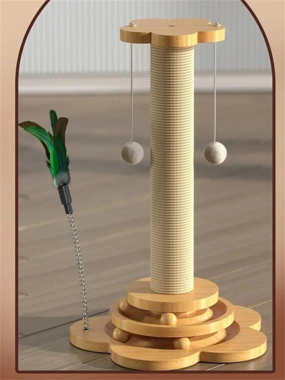 Un juguete irresistible que combina diversión, ejercicio y descanso para tu gato. Diseñado en madera sólida, este rascador con palo giratorio y base antideslizante estimula el instinto cazador de tu felino mientras protege tus muebles.
